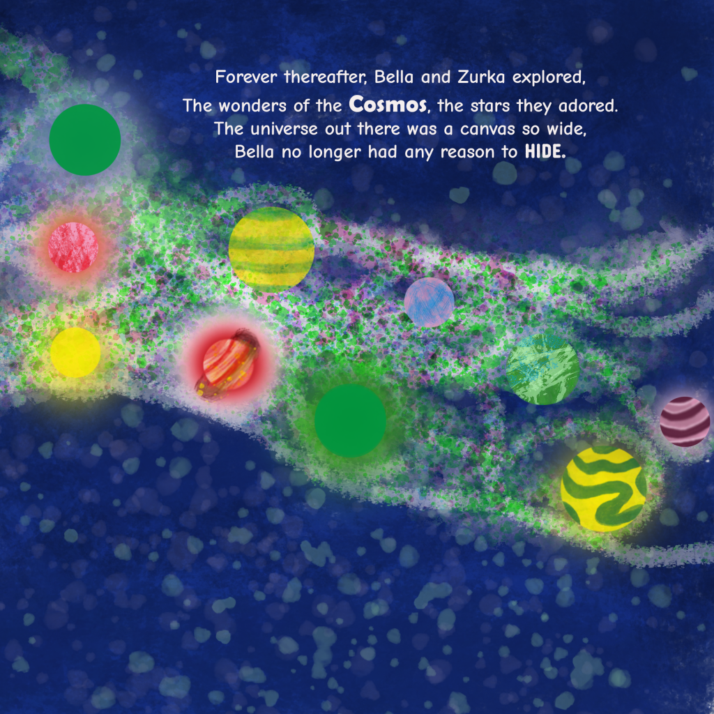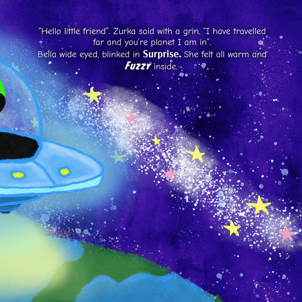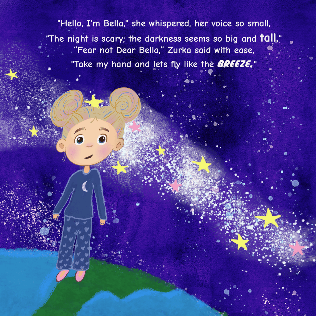 In the quaint village where Bella dwells, the night brings not rest, but fear. Yet, in the twinkling darkness, an unexpected visitor arrives—a quirky alien named Zurka. With a promise of adventure and a hand extended in friendship, Zurka whisks Bella away on a journey through the cosmos, unveiling the enchanting beauty that hides behind the veil of night. Together, they dance among the stars, wander through whimsical worlds, and discover that courage and friendship can illuminate even the darkest of nights. Join Bella and Zurka on an unforgettable odyssey where fear transforms into wonder and the mysteries of the universe become their playground. Through their tale of bravery and companionship, “Bella’s Adventures: A Story of Friendship and Courage” reminds us that the night is not something to be feared, but to be embraced.